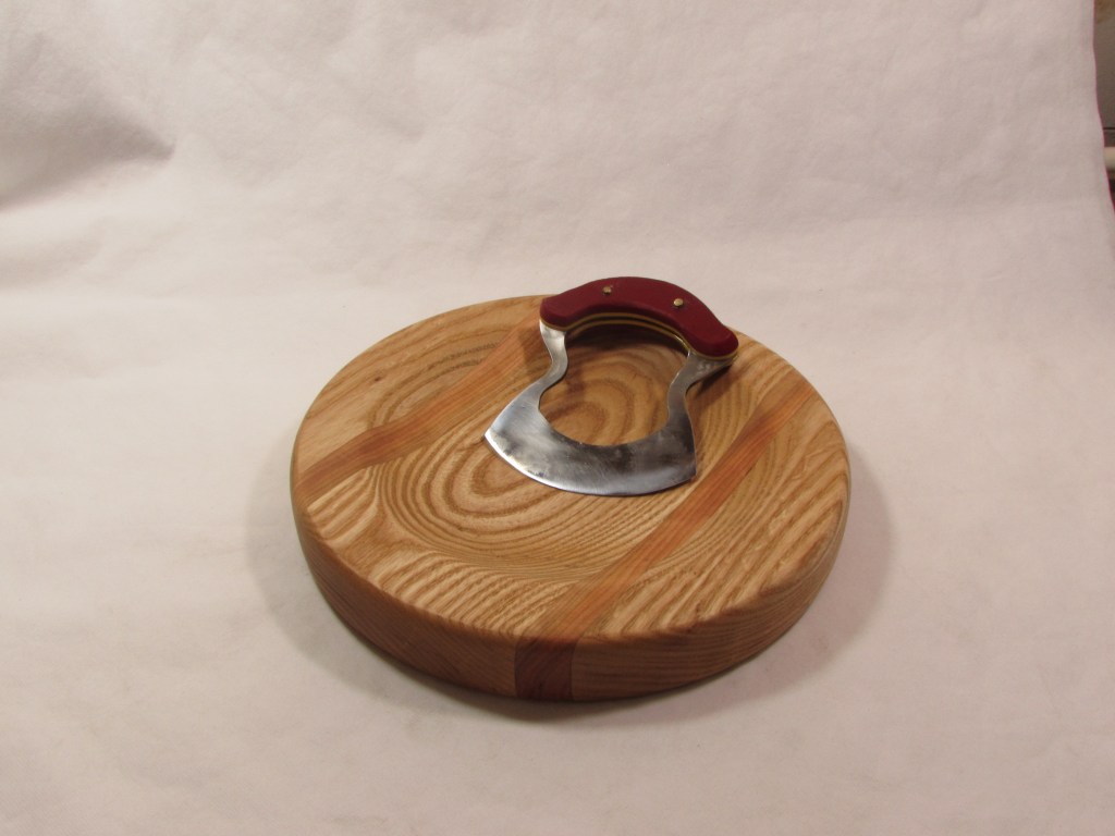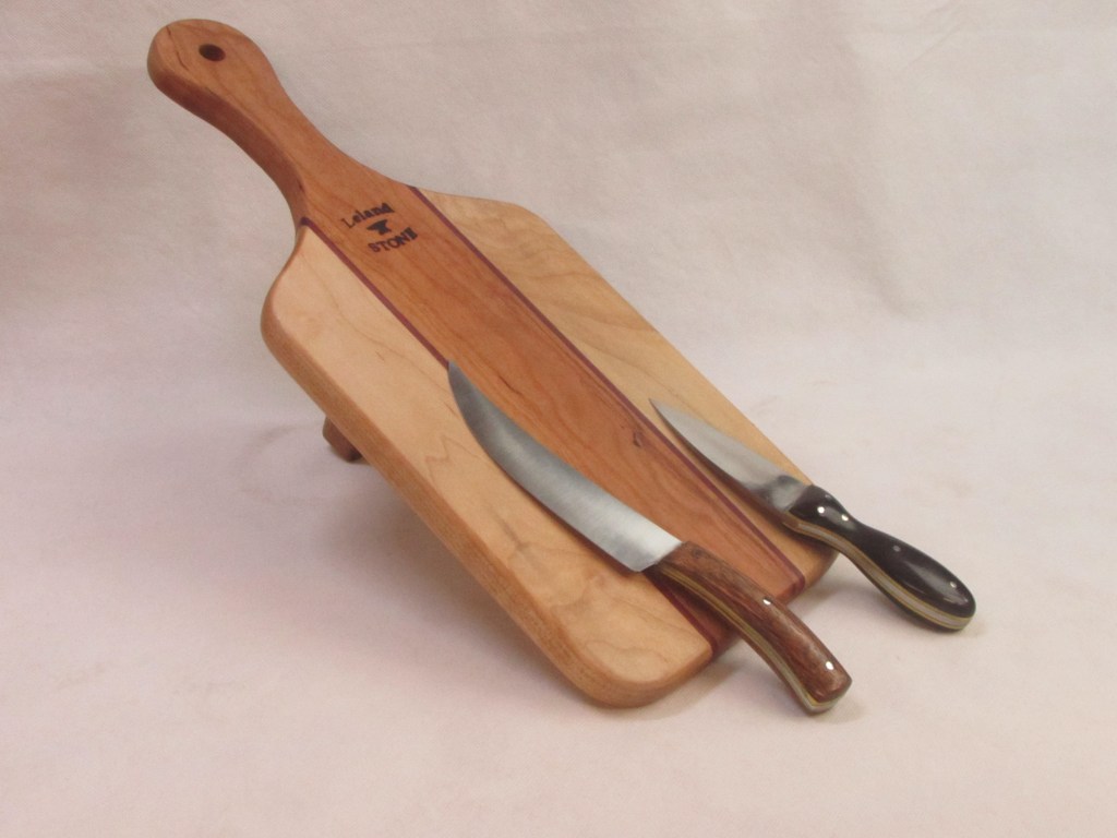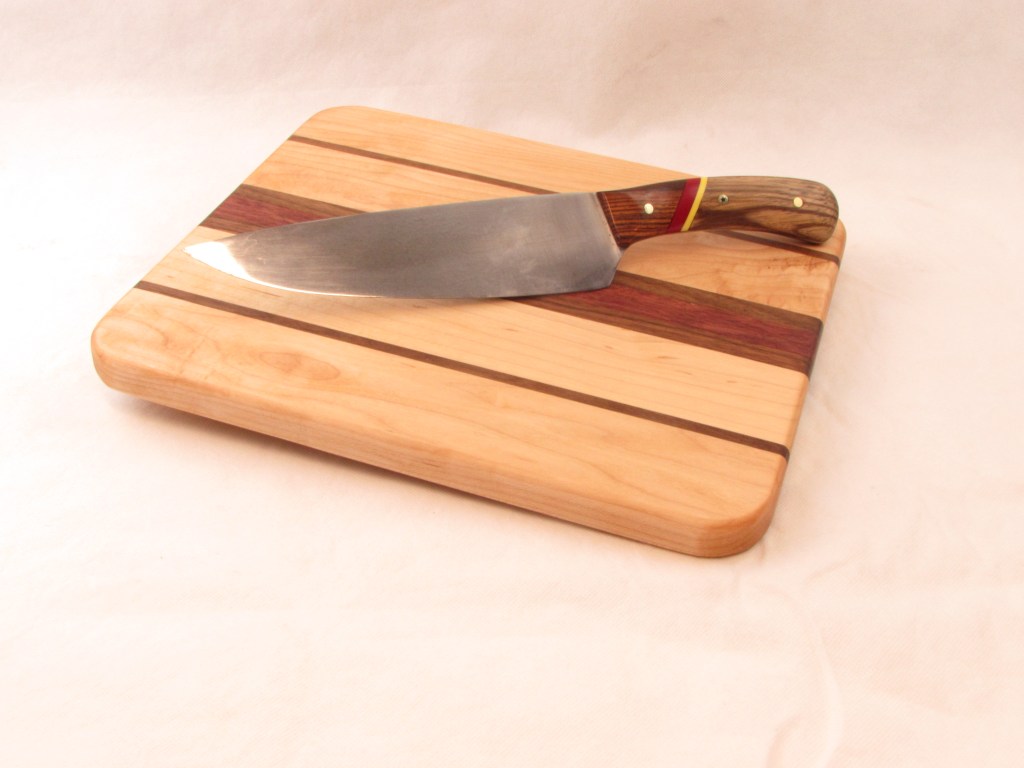Paring knives shown with a custom cutting board I make of cherry, purple heart, and maple.