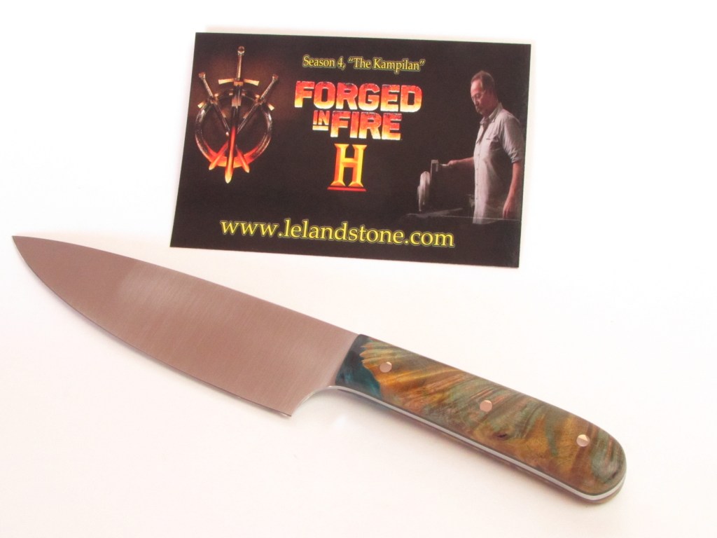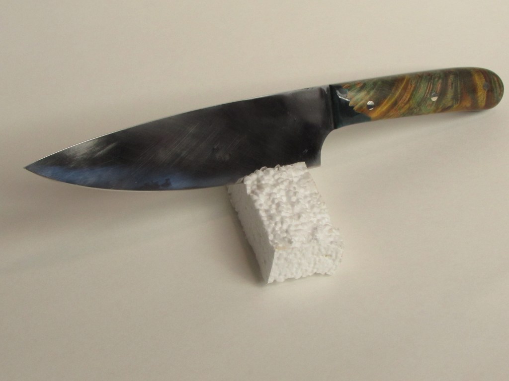Another Chef Knife of hand-forged 5160 steel, accented by burl and acrylic scales and nickel pins.