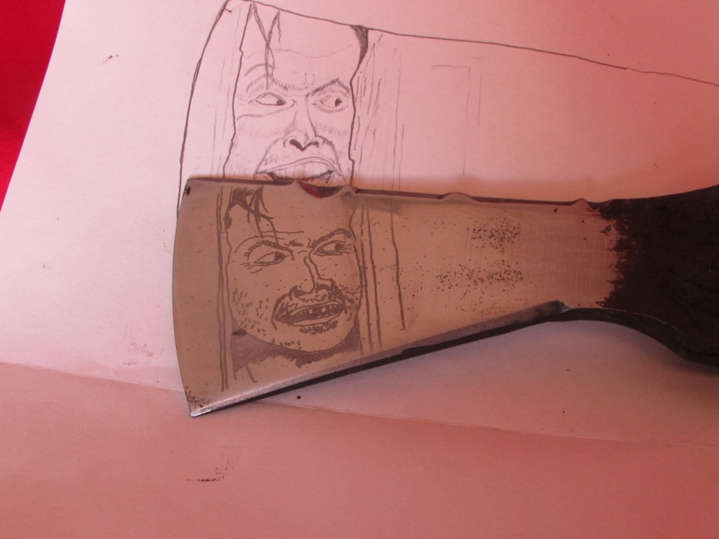 Fire welded, the head was polished and etched; shown here in development from a drawing to completed tool. Decorative file work was added to the top edge before heat treating.